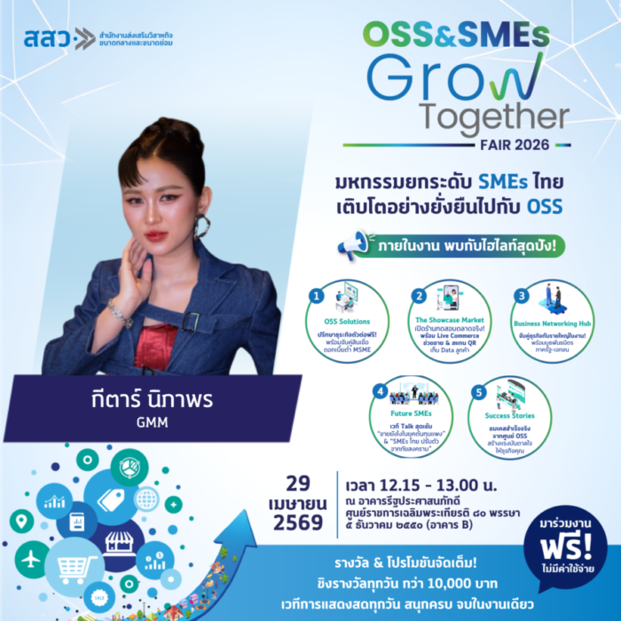 จึงขอเชิญชวนประชาชนทั่วไปเข้าร่วมชม ชิม ช้อป และให้กำลังใจผู้ประกอบการไทยได้ภายในงาน “OSS & SMEs GROW TOGETHER FAIR 2026” ระหว่างวันที่ 27–29 เมษายน 2569 ณ ศูนย์ราชการเฉลิมพระเกียรติฯ อาคารบี ถนนแจ้งวัฒนะ เข้าร่วมงานได้โดยไม่เสียค่าใช้จ่าย