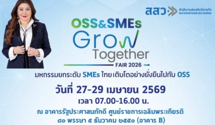 กรุงเทพฯ – สำนักงานส่งเสริมวิสาหกิจขนาดกลางและขนาดย่อม (สสว.) ประกาศความพร้อมจัดงานมหกรรม “OSS & SMEs GROW TOGETHER FAIR 2026” ภายใต้แนวคิด “สร้างโอกาสและเติบโตไปกับ OSS” รวบรวมสุดยอดผู้ประกอบการ SME คุณภาพจาก 77 จังหวัดทั่วประเทศกว่า 280 ร้านค้า พร้อมเปิดดีลธุรกิจ Business Matching ยกระดับมาตรฐาน SME ไทยสู่สากล ระหว่างวันที่ 27–29 เมษายน 2569 ณ อาคารรัฐประศาสนภักดี (อาคาร B) ศูนย์ราชการเฉลิมพระเกียรติฯ ถนนแจ้งวัฒนะ